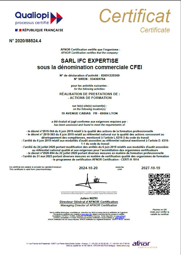 Dans une démarche d’exigence de qualité, le CFEI est inscrit dans le processus d’évaluation « Qualiopi », afin de garantir à ses stagiaires des formations répondant aux critères de la Réforme « Avenir professionnel » et au Référentiel national qualité. Cette certification vous garantit un niveau d’enseignement premium régulièrement contrôlé, et le maintien des prises en charge financière par vos OPCO.